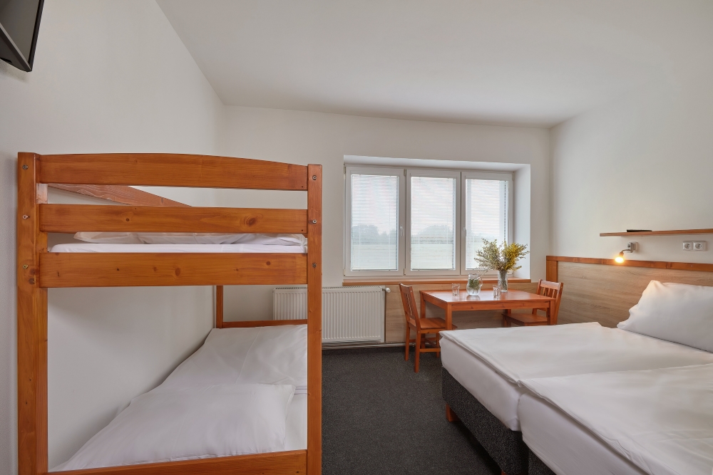 Komfortní pokoj se čtyřmi lůžky a vlastní koupelnou se sprchou. K dispozici je televize, dostatek úložného prostoru, manželská postel nebo dvoulůžko a palanda. Bezplatné Wi-Fi, parkování zdarma přímo u penzionu, je zde také terasa k posezení a možnost využití úschovny kol. Hosté mají přístup k společné kuchyni vybavené lednicí, troubou, mikrovlnkou, sporákem a nádobím. Snídaně je k dispozici za poplatek.